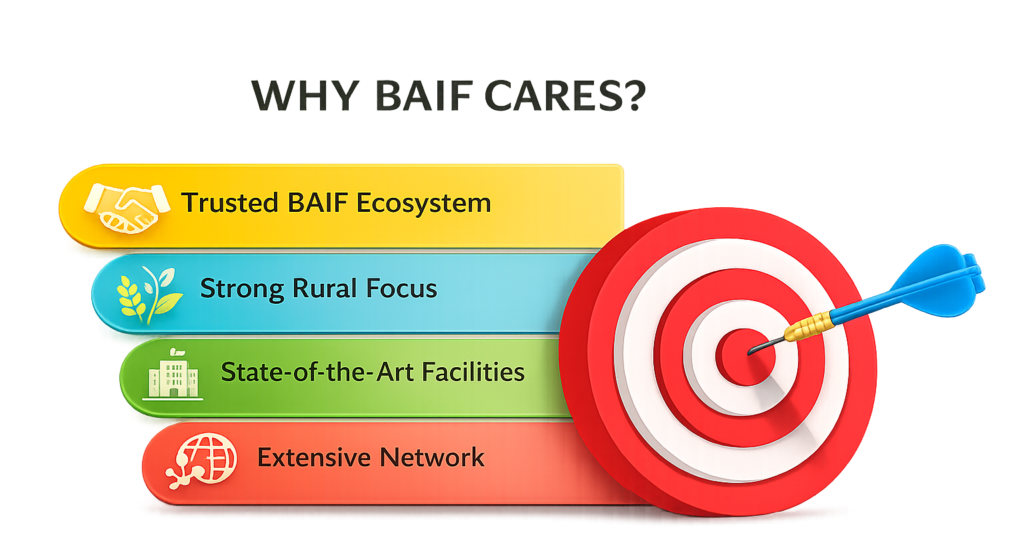 BAIF Council for Advancement in Rural Entrepreneurship and Sustainability (BAIF CARES) is an innovation and startup incubation centre supported by BAIF Development Research Foundation (बायफ). BAIF CARES is focused on promoting rural entrepreneurship in sectors such as agri-business, livelihood, animal husbandry and waste management. Backed by BAIF’s decades-old experience as well as presence in 17 states, BAIF CARES aims to become the leading catalyst for rural innovation and sustainable entrepreneurship — empowering startups to build scalable, inclusive, and resilient solutions that drive prosperity, equity and sustainability in the rural economy.